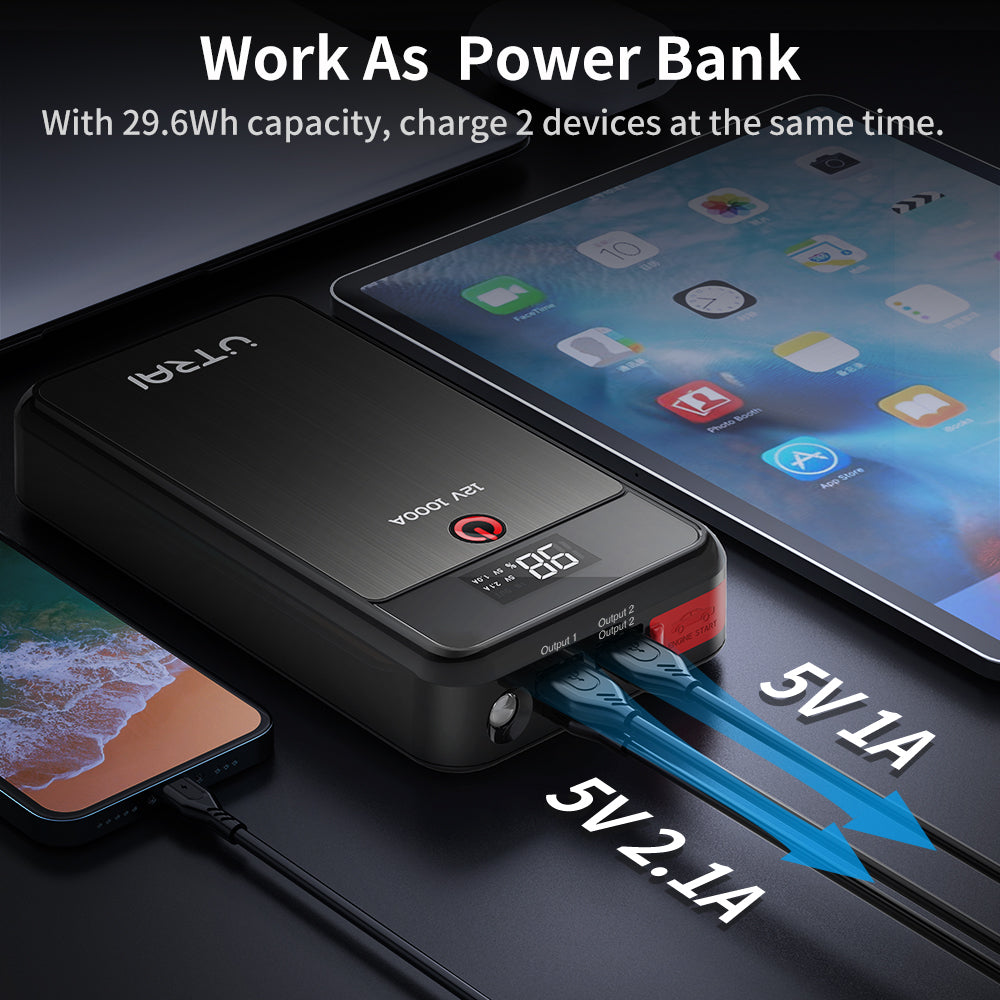 - With 2 USB outputs, working as power bank to charge your smart devices like phones and tablets.