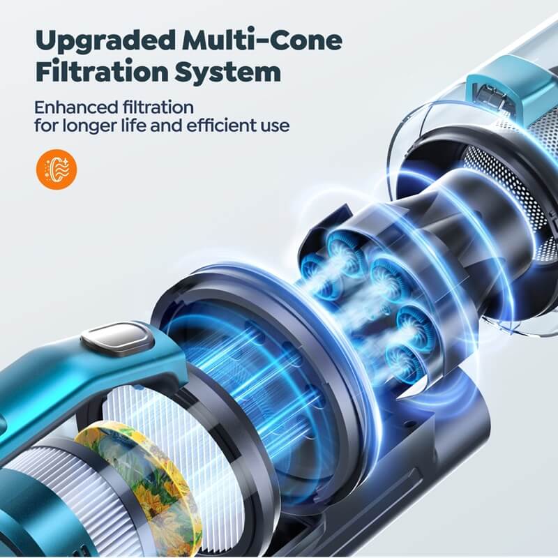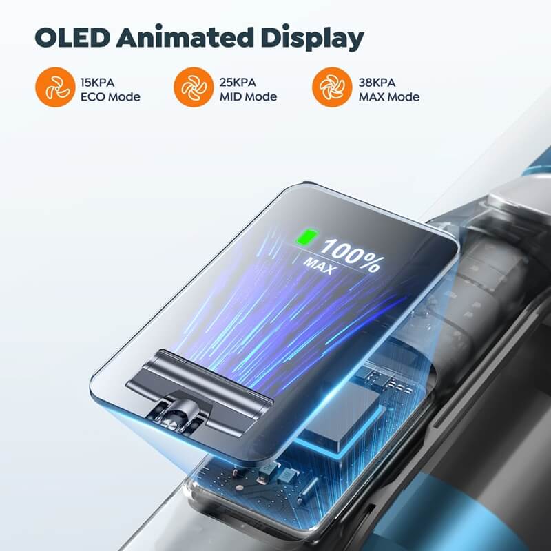 Enjoy efficient cleaning with a 7-layer filtration system and stay informed with an all-in-one LED screen showing modes, charging, and blockage alerts.